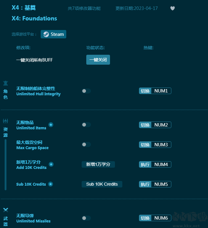 X4祭奠修改器专为游戏《X4祭奠》打造,为X4祭奠游戏玩家们提供丰富的游戏辅助,让游戏更轻松。包括无限制的船体完整,无限物品,最大载货空间,无限导弹等等,让玩家能够轻松通关!感兴趣的朋友不要错过,KK下载站推荐大家下载体验!