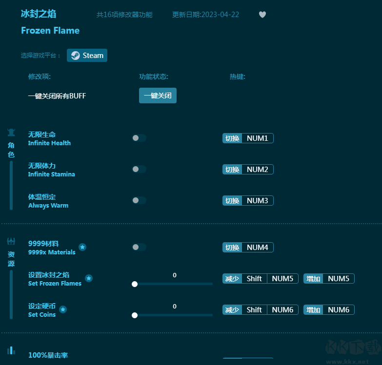 《冰封之焰》开放世界冒险游戏,运用冰的力量进行战斗。这款《冰封之焰修改器》为玩家提供无限生命,无限体力,体温恒定,999材料,100%暴击,设定硬币等众多游戏辅助,帮助玩家游戏战斗冒险更爽快!感兴趣的朋友不要错过,KK下载站推荐大家下载体验!