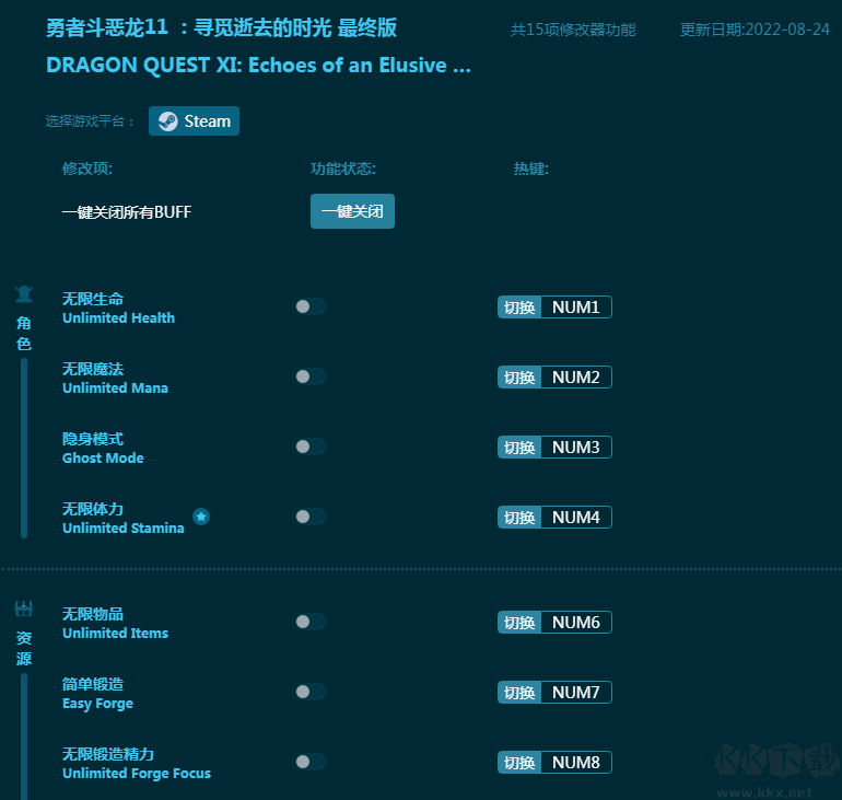 《勇者斗恶龙11寻觅逝去的时光最终版》包括了勇者斗恶龙11游戏以及额外剧情内容。而这款《勇者斗恶龙11修改器》是专门打造,提供玩家无限生命,无限魔法,隐身,无限体力,无限物品,简单锻造等辅助功能,帮助玩家游戏体验更精彩!有需要的朋友不要错过,KK下载站推荐大家下载体验!