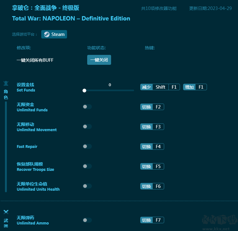 《拿破仑全面战争终极版》包含了拿破仑全面战争游戏的所有DLC内容,而这款《拿破仑全面战争终极版修改器》专为玩家打造,提供无限资金,无限移动,恢复部队规模,无限单位生命值,无限弹药等等游戏辅助功能,帮助玩家获得更爽快的游戏体验!有需要的朋友不要错过,KK下载站推荐大家下载体验!