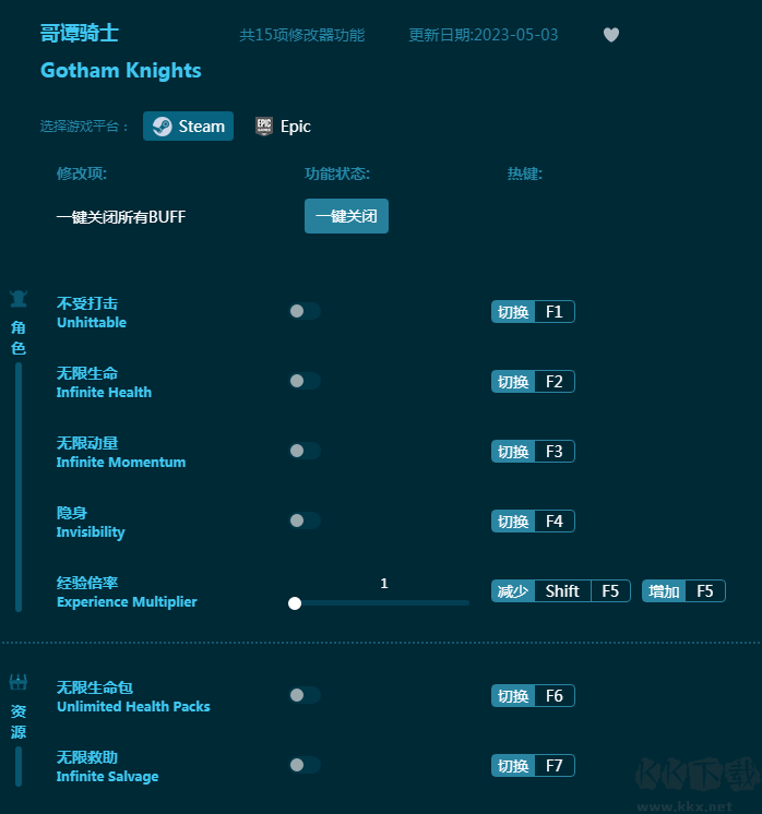 哥谭骑士修改器专为游戏《哥谭骑士》的玩家们打造的全能游戏辅助工具。内置不受打击,无限生命,无限动量,隐身,无限生命包,无限救助等十五项游戏辅助功能,帮助玩家轻松通关游戏,守护哥谭!有需要的朋友不要错过,KK下载站推荐大家下载体验!
