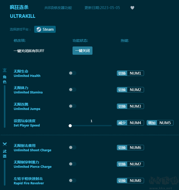 《疯狂连杀》是好评如潮的动作节奏射击游戏,操控你的角色开始超爽快的射击冒险。这款《疯狂连杀修改器》能让玩家游戏体验更爽,提供无限生命,无限体力,无限连跳,无限射击费用,无限穿刺蓄力等多项游戏辅助功能,游戏体验超爽!有需要的朋友不要错过,KK下载站推荐大家下载体验!