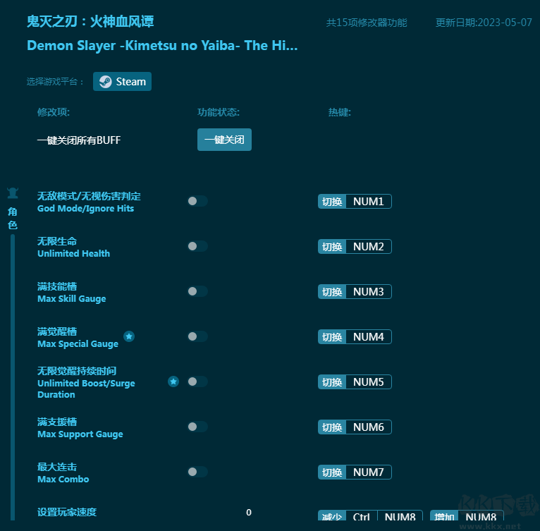 《鬼灭之刃火神血风谭》带你重温原作经典剧情,多种玩法,还能2V2对战。而这款《鬼灭之刃火神血风谭修改器》能帮助玩家降低游戏难度,提供无敌模式,无限生命,满技能槽,满觉醒槽,无限觉醒持续时间,最大连击等众多游戏辅助功能,让玩家的游戏体验更爽快!感兴趣的朋友不要错过,KK下载站推荐大家下载体验!