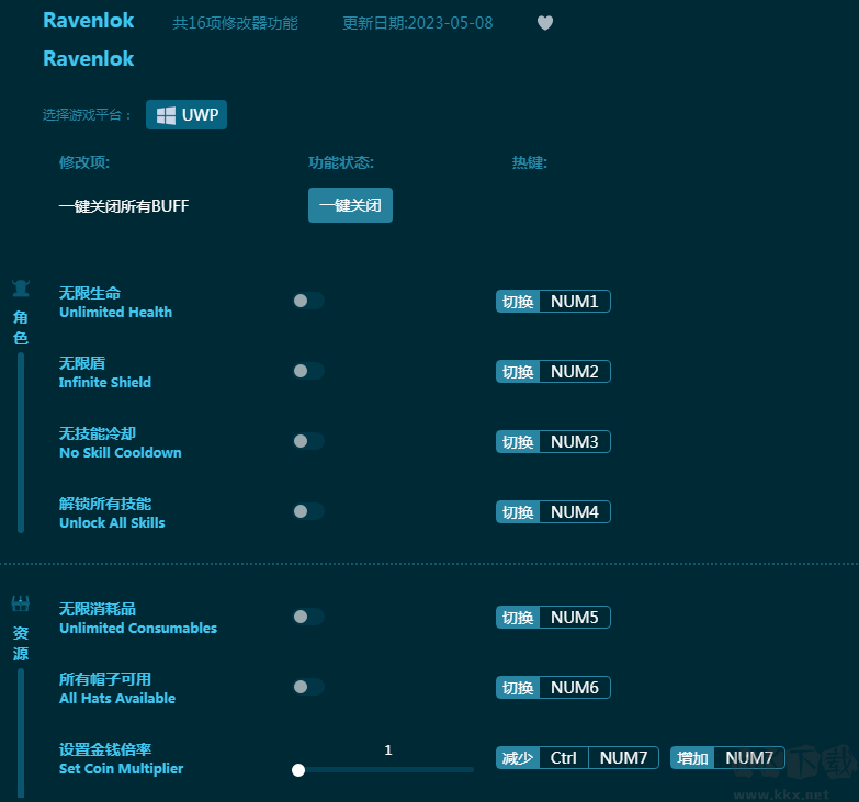 《Ravenlok》是一款童话风的RPG动作冒险游戏,探索童话幻想世界。这款《Ravenlok修改器》为玩家提供无限生命,无限盾,无技能冷却,解锁所有技能,无限消耗品,所有帽子可用等十六项游戏辅助,帮助玩家游戏体验更佳!感兴趣的朋友不要错过,KK下载站推荐大家下载体验!
