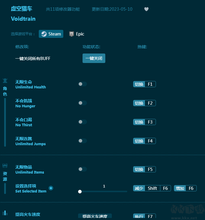 《虚空列车》是一款无限流的肉鸽游戏,驾驶列车进入不同的世界战斗冒险。KK下载站带来《虚空列车修改器》提供玩家无限生命,不会饥饿,不要口渴,无限连跳,无限物品,提高火车速度等十一项游戏辅助,免费使用,穿梭不同世界,游戏体验更精彩!感兴趣的朋友不要错过,KK下载站推荐大家下载体验!