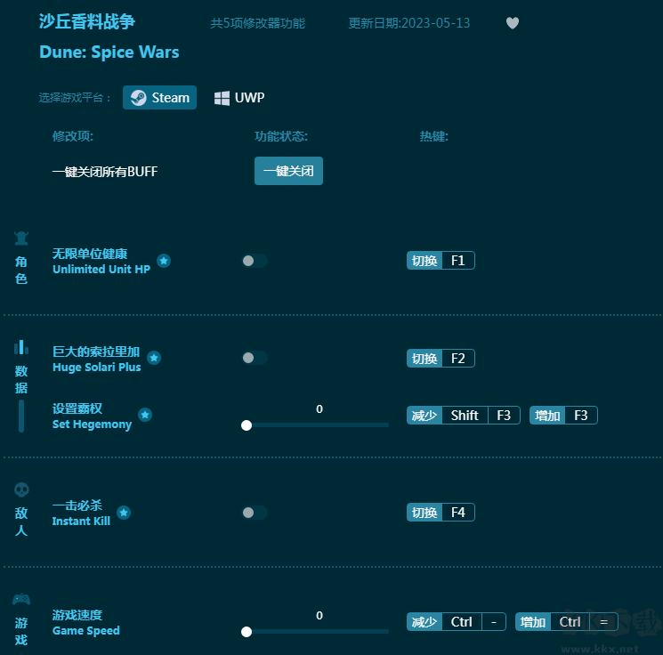 《沙丘香料战争》基于科幻小说《沙丘》改编,是一款4X元素的即时战略游戏。而这款《沙丘香料战争修改器》能帮助玩家降低游戏难度,提供无限单位健康,一击必杀,巨大的索拉里加,设置霸权等众多强力游戏辅助,让玩家游戏体验更佳!感兴趣的朋友不要错过,KK下载站推荐大家下载体验!