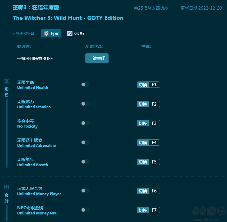 《巫师3狂猎年度版》在原版游戏的基础上加上了全部附加游戏内容,而这款《巫师3狂猎年度版修改器》为带来全部游戏内容的修改功能,包括无限生命,无限体力,不会中毒,无限氧气,无限金钱,无限肾上腺素等二十五项游戏辅助,全游戏可用,帮助玩家轻松通关!有需要的朋友不要错过,KK下载站推荐大家下载体验!