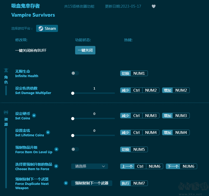 《吸血鬼幸存者》是绝对经典的像素Rouge游戏,操控你的角色对抗不断入侵的怪物,不断升级获取技能,道具,装备等等,你会越来越强。这款《吸血鬼幸存者修改器》提供玩家无限生命,无限金钱,无限硬币,伤害倍数,强制升级等十五项修改辅助,且使用免费,帮助用户轻松通关!感兴趣的朋友不要错过,KK下载站推荐大家下载体验!