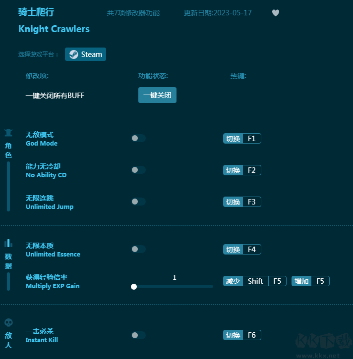 《骑士爬行》是一款中世纪背景的地牢rouge动作游戏,进入地牢冒险,给你独一无二的游戏体验。KK下载站带来《骑士爬行修改器》专为玩家打造,提供无敌模式,能力无冷却,无限连跳,无限本质,一击必杀等强力辅助,让玩家的游戏体验更刺激!感兴趣的朋友不要错过,KK下载站推荐大家下载体验!