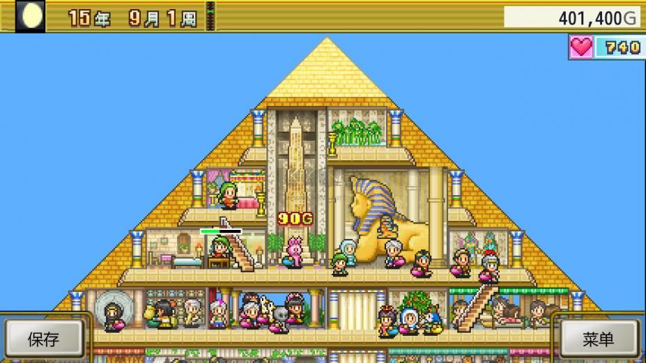 金字塔王国物语(The Pyraplex)是一款由Kairosoft开发的模拟经营类游戏。游戏背景是在古埃及时期,玩家需要扮演一位古埃及城市的建造者,建造一座庞大的金字塔,吸引更多的游客来到城市,提高城市的声望和繁荣度。