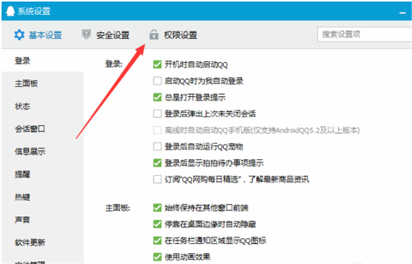 1.运行qq,在其系统设置界面中找到权限设置,点击权限设置。
