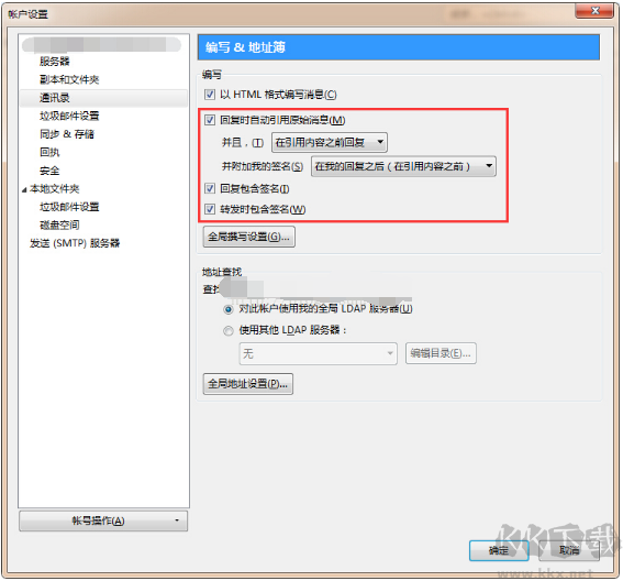2、在 “账户设置” 界面的 “通讯录” 下设定签名位置,完成后点击 “确定”。