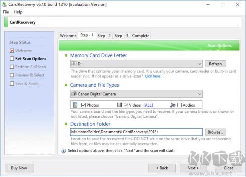 2、用户选择驱动器号,摄像头类型和目标文件夹以保存恢复的文件