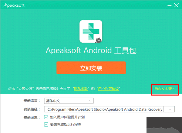 安装向导默认设置的软件默认安装路径为C:\Program Files (x86)\Apeaksoft Studio\Android Data Recovery