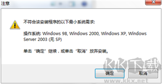 2、当下多数人使用的电脑搭载 Win7 及以上版本操作系统,此时可能会弹出提示窗口显示 “不符合该安装程序的以下最小系统要求......”,遇到这种情况,使用者不用理会,直接点击 “确定” 就能继续后续安装步骤。