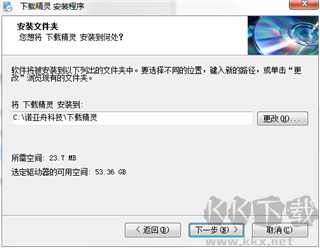 6、可以自行设定诺亚舟下载精灵的安装位置,系统默认的安装位置是 C:\ 诺亚舟科技 \ 下载精灵,点击 “更改” 按钮能更换安装位置,也可直接采用默认设置并点击下一步。