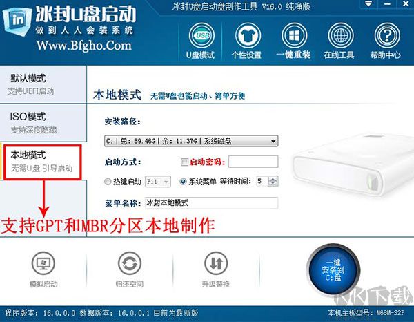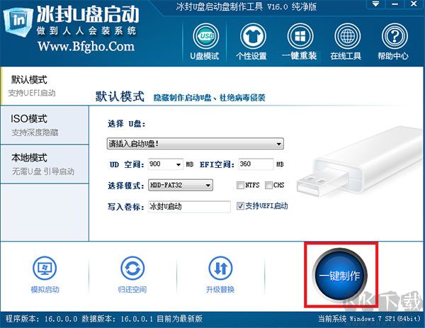 冰封U盘启动盘制作工具是一款实用的U盘启动盘软件。它现在是最安全、最可靠的方式,多数同类软件存在捆绑软件等影响使用体验的问题,但是它不欺骗、不夸大、不捆绑、不流氓、不锁定,使用非常的清爽。它提供默认模式、ISO模式和本地模式三种制作方式,能帮助用户轻松制作U盘启动盘,而且兼容99%的各类电脑和系统。还支持个性设置,降低操作门槛,让每个人都能轻松用U盘装系统。需要的朋友快来下载试试吧!