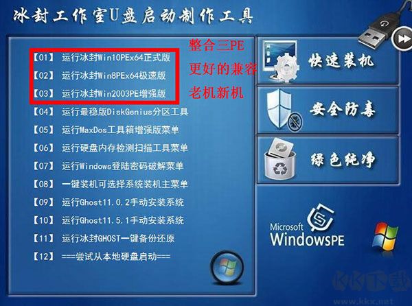 3、制作成功,冰封U盘启动工具整合三PE,更好的兼容老机新机