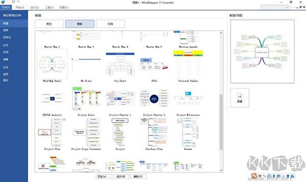 1、在MindMapper里,我们有两种方式创建树状图,这两种方式分别是样式创建,以及模板创建。创建的方法都是通过点击左上角的“新建”获取导图构建选项,然后在右边的新建选项列表中选择“样式”或者“模板”创建。