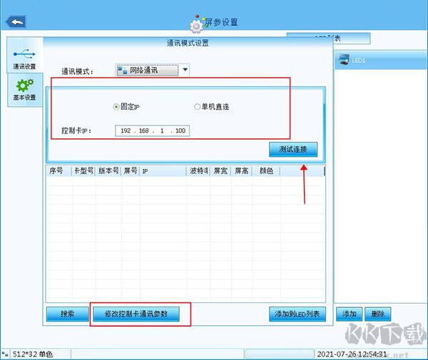 4、点击下方的“修改控制卡通讯参数”来对控制卡的IP进行修改,然后点击“测试连接”,连接成功后就实现了软件与 LED 控制卡的同步显示。