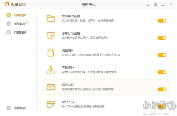 U盘保护:对外接U盘即插即扫,防止移动设备传播病毒。
