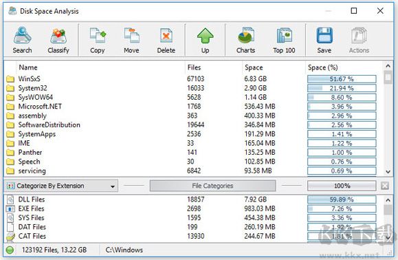DiskBoss提供高级磁盘空间使用情况分析功能,允许用户轻松分析一个或多个本地磁盘、网络共享或NAS存储设备确定包含大量磁盘空间的目录和文件,生成各种类型的饼图,并保存磁盘空间分析报告。