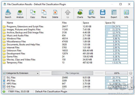 DiskBoss能够扫描磁盘、网络共享和NAS存储设备,并使用多种不同类型的文件分类插件对文件进行分类。DiskBoss自动识别3500多种类型的文件,并允许用户浏览分类文件层次结构,生成各种类型的饼图,保存文件分类报告,对文件类别执行文件管理操作,并根据用户定义的规则对文件进行物理重组和政策。