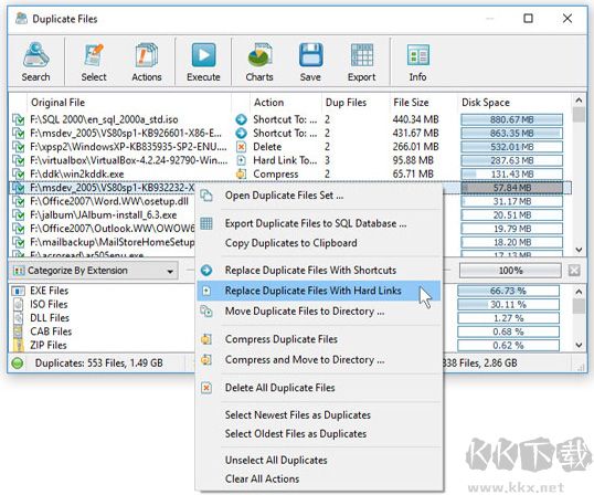 DiskBoss包括一个内置的重复文件查找器,它提供了大量高级功能,允许搜索和清除重复文件服务器、NAS存储设备和企业存储系统中的文件。DiskBoss重复文件查找程序允许搜索重复文件,生成各种类型的文件饼图,保存报告,删除重复文件,用链接替换重复文件,并将压缩的重复文件移动到其他位置。