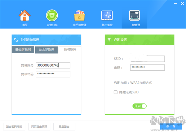 一键管理工具简化了路由器常规配置的过程,包括外网连接调整、WIFI参数设置、路由口令重设、网页路由控制和重启路由等。每个工具均对应路由器的基本管理功能,方便快捷。
