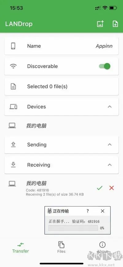 3、最后一步,LANDrop 会出现一个验证码,需要接受端设备确认才开始正式传输文件:
