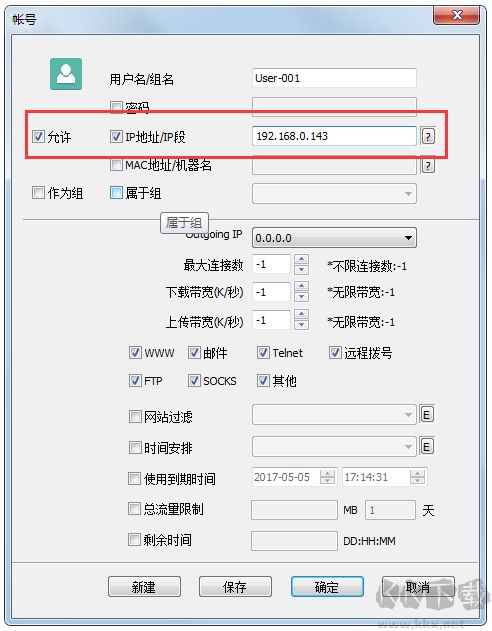 6、在点击“新建”按钮后弹出的“账号”对话框,需要勾选的选项默认,不需要更改,在“IP地址/IP段”右侧的框中填写要使你允许通过你的电脑代理上网的对方的IP地址,格式如:192.168.0.143;如果允许多台电脑,则多次操作第2-3步骤;