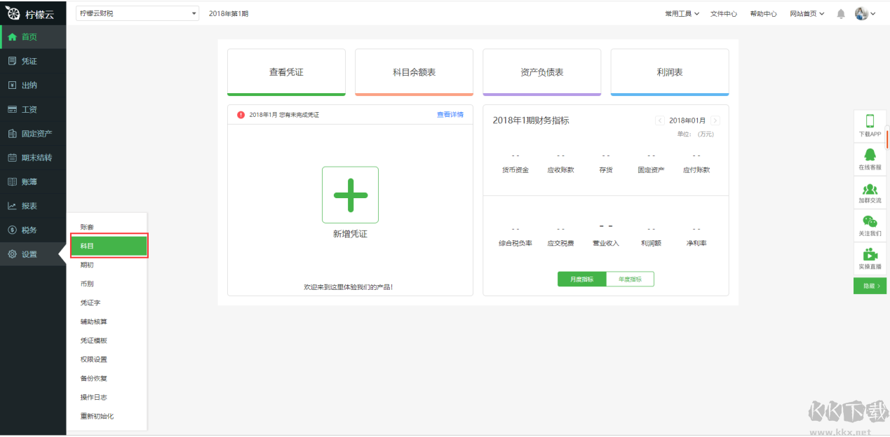 2、如果你要新增科目,您可以点击左侧的【设置】在弹出的选项中点击【科目】。