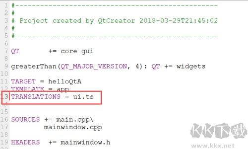 2、于工程配置文件内,增加一行内容:TRANSLATIONS = ui.ts。