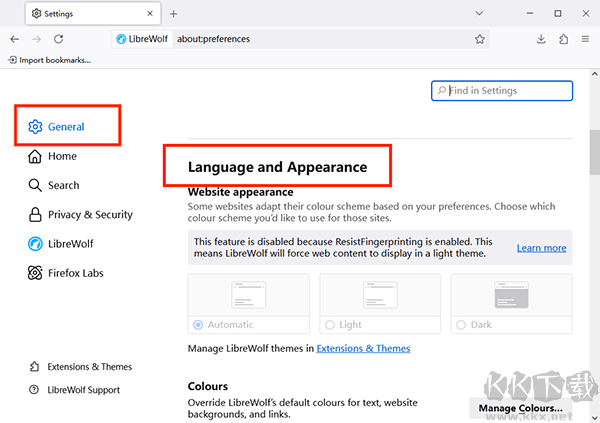 2、在“General”一栏中下滑至“Language and Appearance”部分。