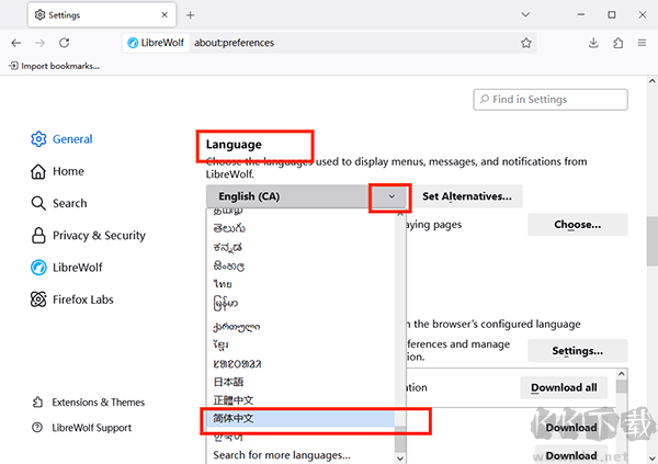 3、再下滑至“Language”部分,选择简体中文即可切换。