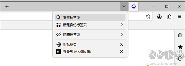 5、搜索标签页、新建身份标签页、隐藏标签页、新标签页、登录到Mozilla 账户。