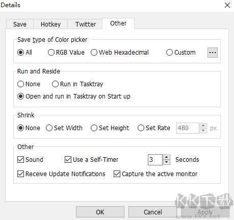 保存的颜色,可选项All全部、RGB、Web网络传输色。然后就是一些细节的设置了,定时器也在里面哦。