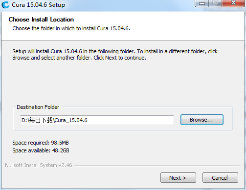 1、将kkx分享的这款【Cura】切片工具解压到当前文件夹中,点击的Cura_15.04.6.exe应用程序,选择软件安装位置界面,安装路径保持默认即可!