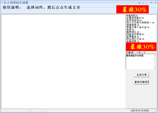 选择词库,然后点击生成文章。软件本身提供了多个词库,你也可以自己添加词库。