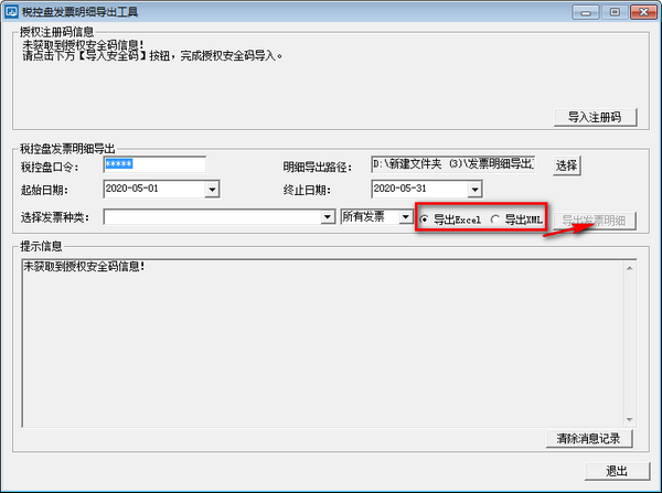二、安装完成后打开软件,插入税控盘,输入税控盘口令,选择要导出发票的起止日期和种类。