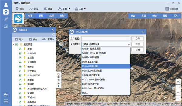 支持导入和导出多种投影的矢量数据,包括WGS84经纬度投影、WGS84 Web墨卡托投影、北京54高斯投影、西安80高斯投影、CGCS2000高斯投影、GCJ02经纬度投影、GCJ02 Web墨卡托投影、BD09经纬度投影和BD09 Web墨卡托投影等