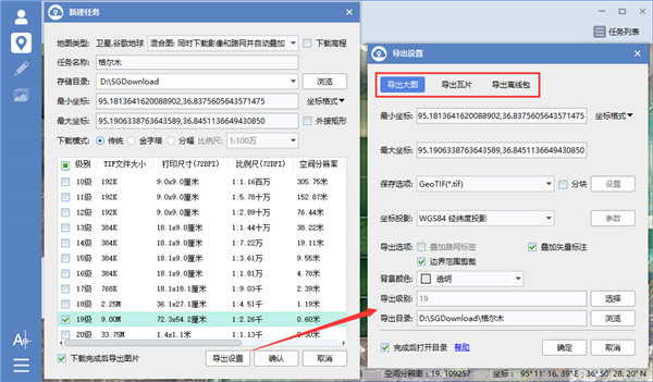 下载的卫星影像或栅格电子地图可以导出TIF\PNG\JPG\BMP大图并进行投影转换,也可以导出原始TMS瓦片、WorldWind瓦片、水经注瓦片和无所不能的自定义瓦片,还可以导出MBTile离线包、OruxMaps离线包、GeoPackage离线包和SQLiteDB离线包等