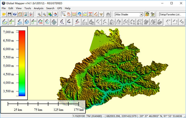下载的高程数据可以直接在GlobalMapper中生成三维地形地貌,效果如下图所示