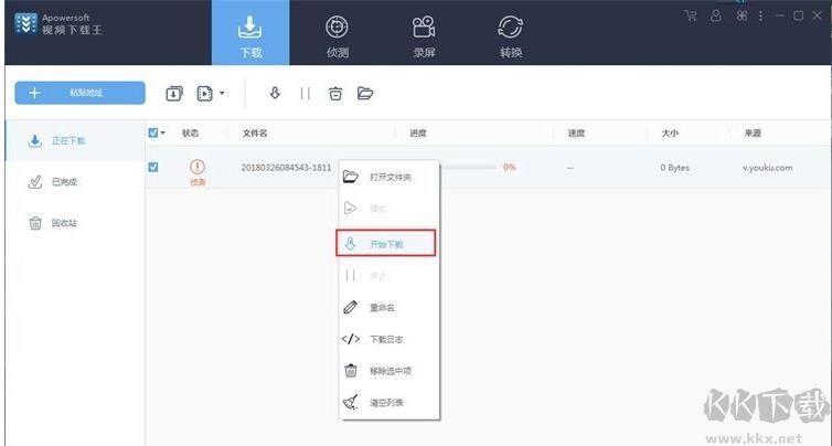 3、Apowersoft视频下载王成功识别出视频链接;用右键点击Apowersoft视频下载王中的任务,在右键菜单中点击开始下载就可以开始下载该视频了;
