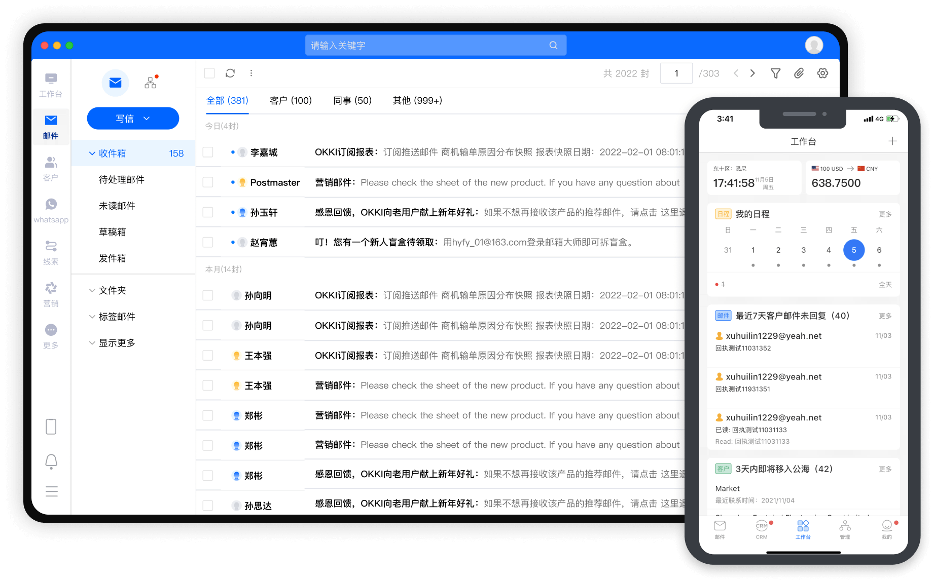 邮件数据多端实时同步更新,新邮件提醒,及时回复客户邮件,锁定每一个商机;联系人卡片,帮助快速识别客户类型,聚合往来邮件,转化邮件线索。