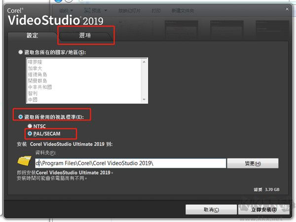 4:点击“选取所有使用的视讯标准”,点击“PAL/SECAM”。是否选择跟换安装位置,看自己个人习惯,直接安装到默认位置即可。选择好之后,先不要点击立即安装,点击“选项”。这里有个小暗舱需要注意一下。 5:取消产品更新和安装Haali Media Splitter。 6:等待软件安装完成。